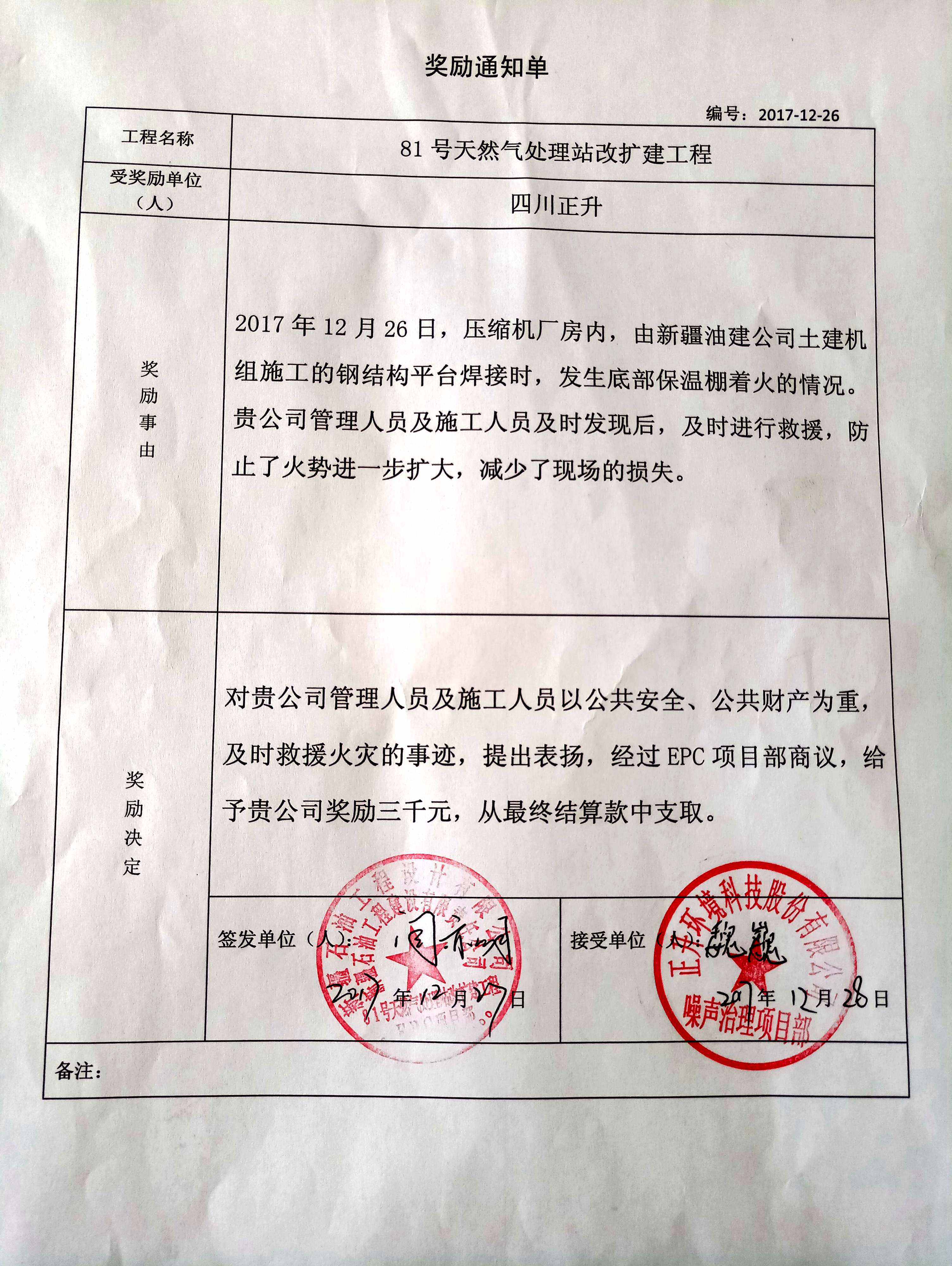 消息傳回公司后,公司依據(jù)《評(píng)比管理辦法》,及時(shí)給予正升新疆81號(hào)站噪聲治理項(xiàng)目部特別嘉獎(jiǎng)2000元,對(duì)這種不計(jì)個(gè)人得失奮勇救火的行為以資表彰。
